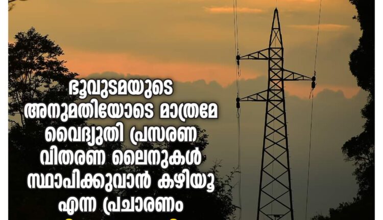 ഭൂവുടമയുടെ അനുമതിയോടെ മാത്രമേ വൈദ്യുതി പ്രസരണ വിതരണ ലൈനുകള് സ്ഥാപിക്കുവാന് കഴിയൂ എന്ന പ്രചാരണം അടിസ്ഥാനരഹിതം.